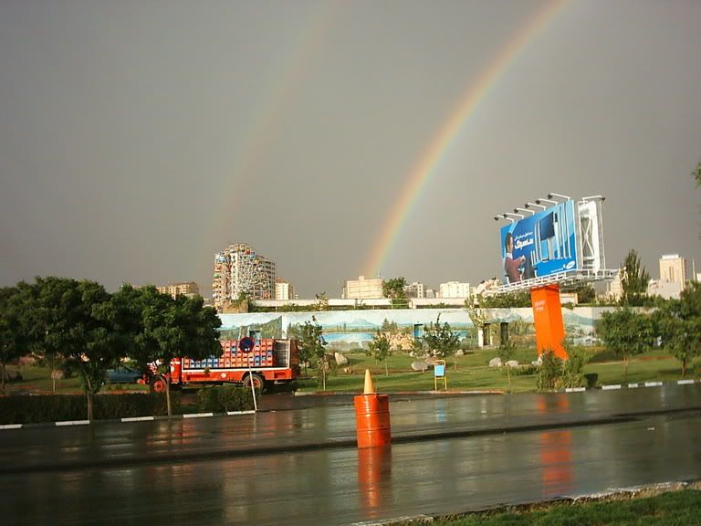 حسي رو كه تو اون دقايق داشتم نمي تونم به خوبي توصيف كنم. از اينكه از زير يه طاق رنگي پر زرق و برق بزرگ كه شهر رو احاطه كرده بود رد مي شديم هيجان شده بودم و عين بچه ها شادي مي كردم. دور برم توي ماشين هاي اطراف مردم بي توجه به اين پديده زيبا رد مي شدند و من از اينكه مي ديدم بقيه نسبت بهش بي تفاوت هستند حرصم گرفته بود. خوبه كه دوربين توي ماشين بود و خوب تر اينكه داداشم ماشين رو مي روند و من فرصت كردم چند تائي عكس بگيرم. نمي دونم اين عكس ها بدرد مي خورن يا نه. شايد بتونم چند تائي عكس از رنگين كمان مردادي تبريز رو اينجا بذارم.